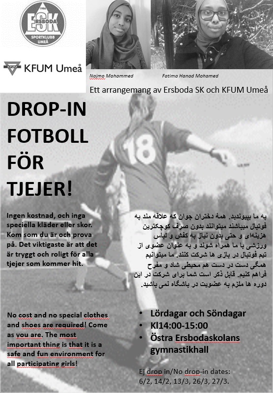 Ersboda SK har tillsammans med KFUM dragit igång drop-in tider för fotbollsintresserade tjejer. Vi kommer att hålla till på Östra Ersbodaskolan under våren 2016. Det spelar ingen roll om du aldrig spelat fotboll förr eller inte, vi välkomnar alla med öppna armar - helt gratis! Våra två ledare Najmo och Fatima kommer regelbundet att få hjälp av UIK-spelare. Det viktigaste är att man kommer dit och har roligt, på en trygg plats. Du behöver inte ha några speciella fotbollskläder om du inte har det, kom som du är! Ta med dig alla dina kompisar, och sprid ordet.