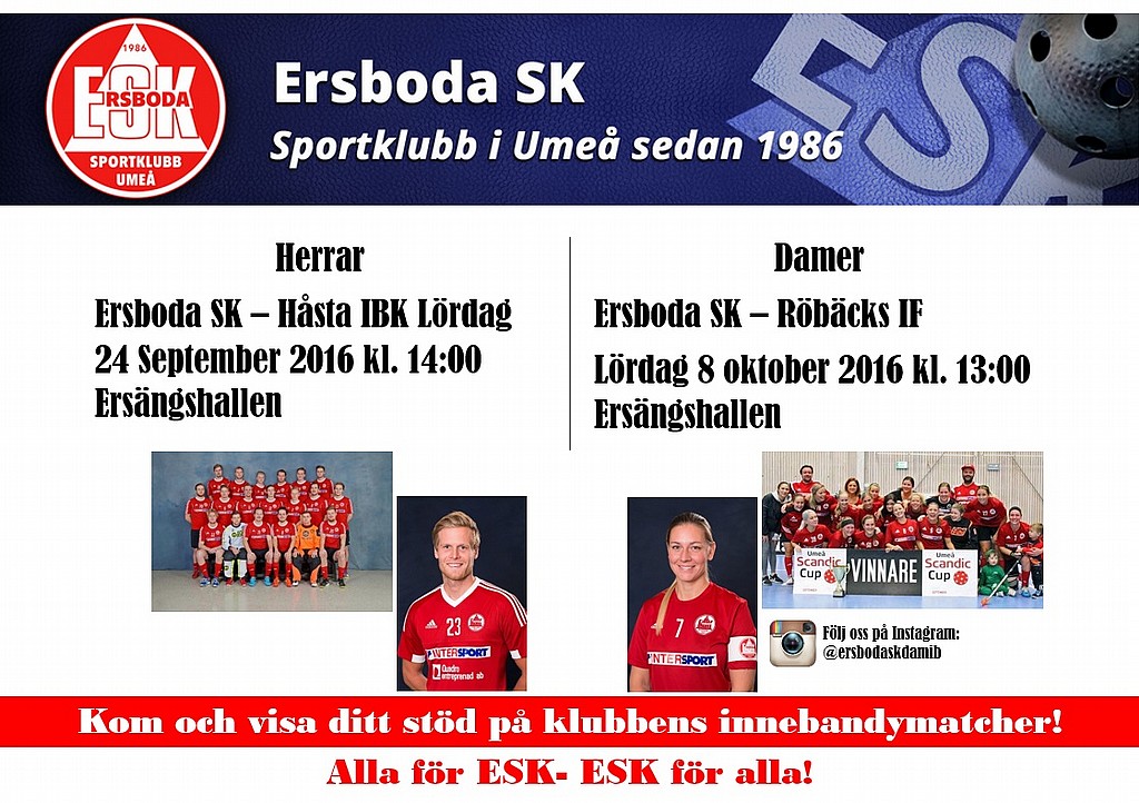Som de flesta ESK-anhängare redan vet kommer herr- och damlaget i år spela Division 1-innebandy. Herrlaget, som i förra helgens premiärmöte besegrade Skellefteå IBK 8-9 på bortaplan spelar sin hemmapremiär redan på lördag, så se till att komma dit i tid för en bra plats på Ersängshallens läktare!
